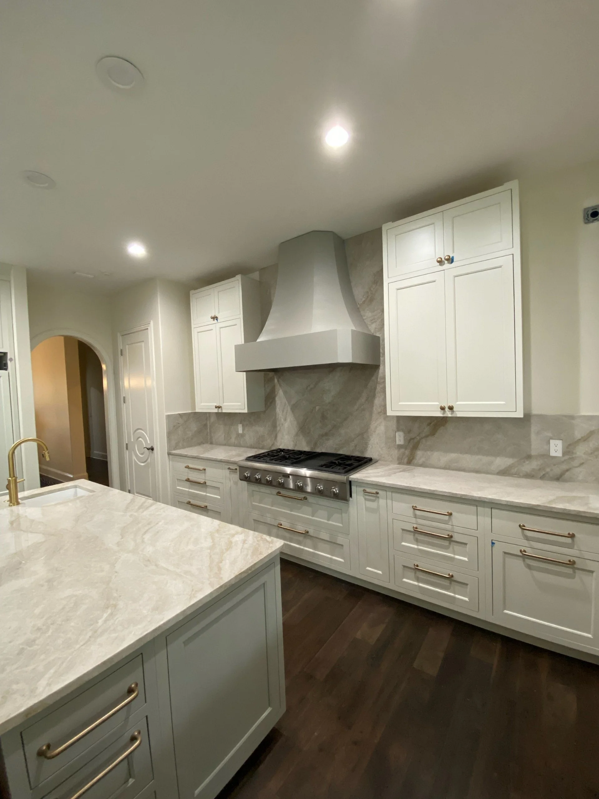 Custom and semi-custom cabinetry, kitchen islands, and durable surfaces designed for everyday use. Available materials include quartz, granite, marble, quartzite, natural stone, solid surface, and Porcelain / Ultracompact Surfaces.